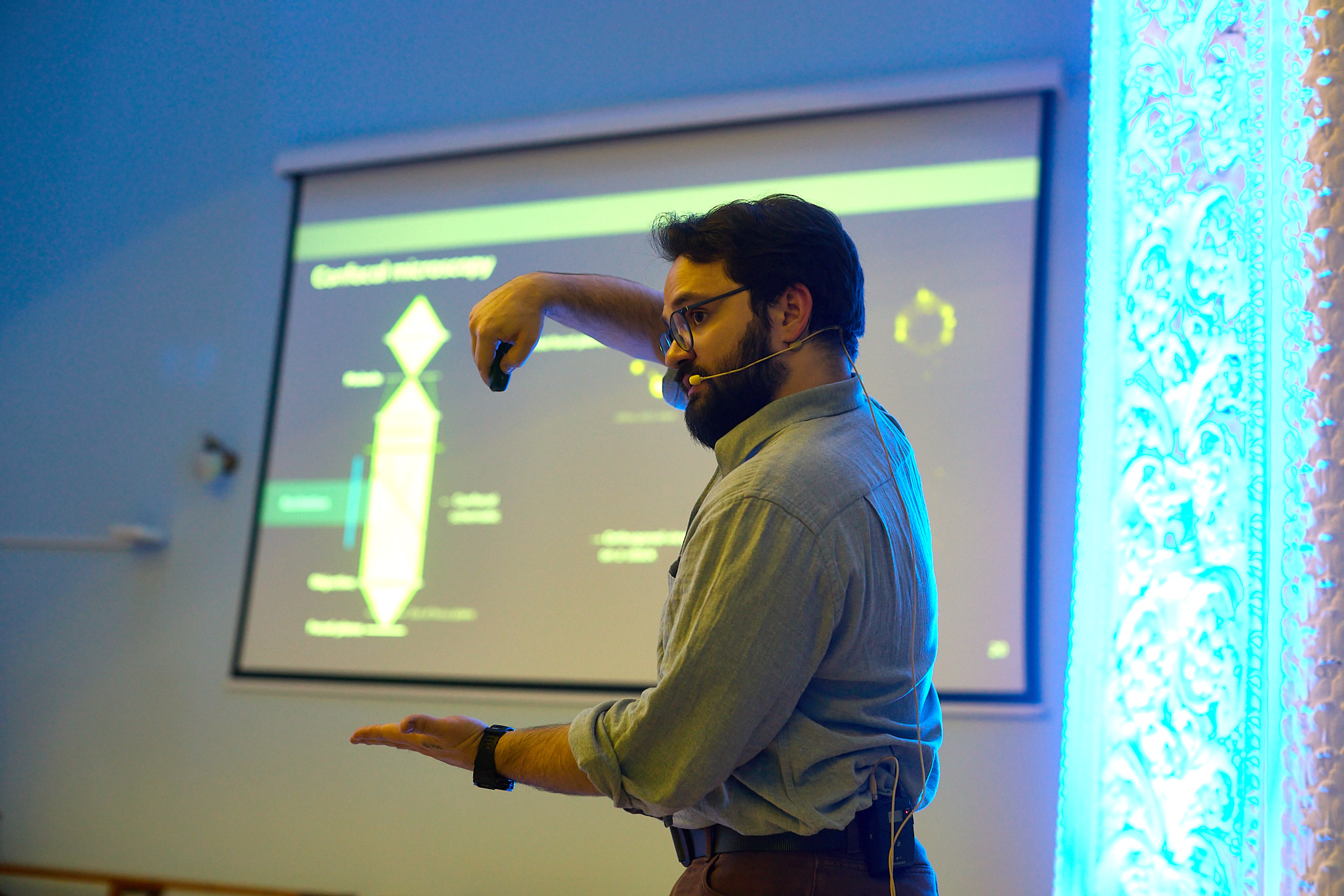 In this lecture, Dr. Olifirov delivered a broad and structured overview of fluorescence imaging as a core methodology in modern biological research. The talk introduced fundamental principles underlying fluorescence microscopy, including the physics of image formation and general concepts of digital imaging, and explained how these principles influence data quality and interpretability. He discussed the theoretical foundations of widely used fluorescence imaging modalities, with particular attention to wide-field and confocal microscopy, and outlined their practical applications and limitations.
